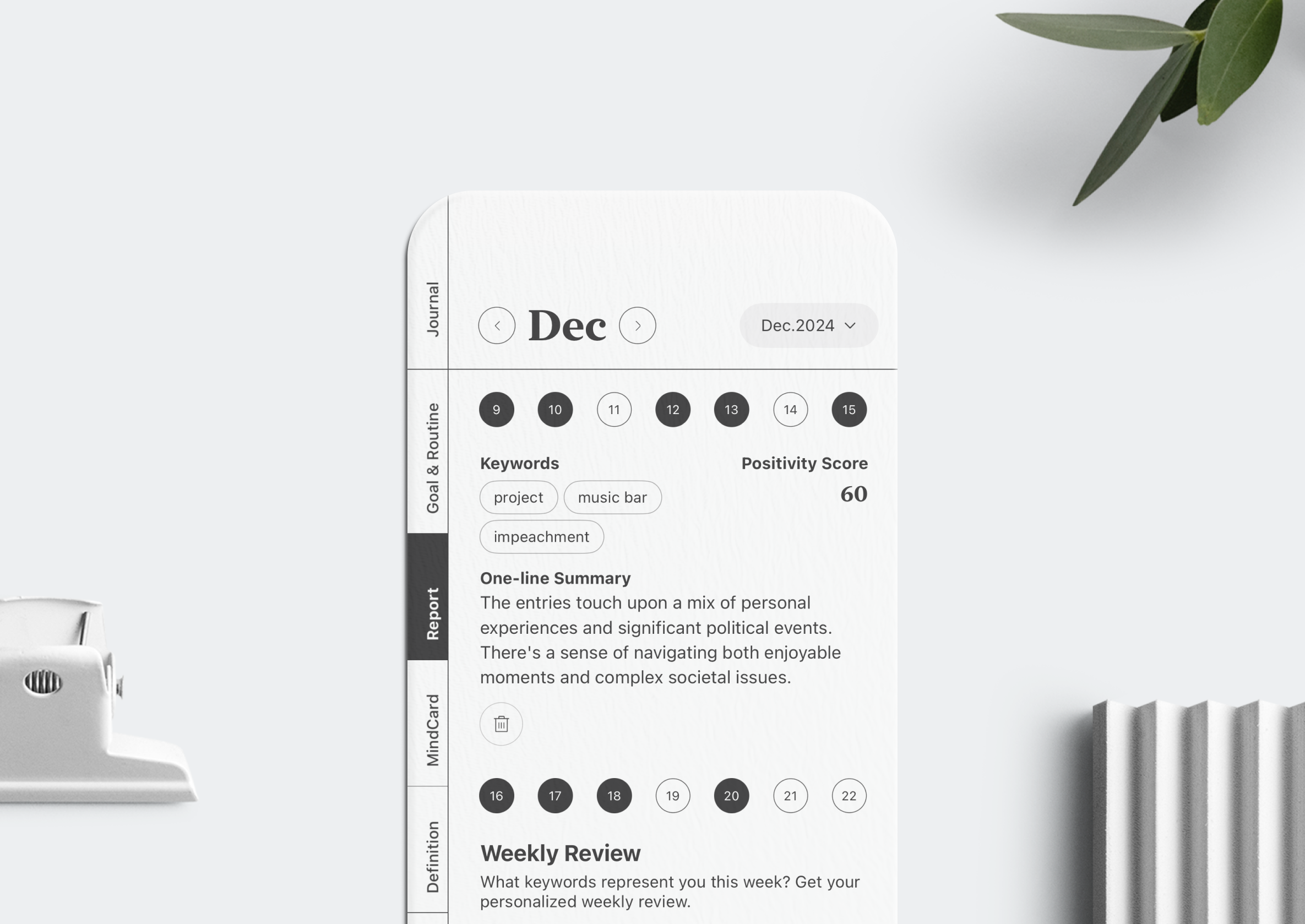When the weekend rolls around, you unlock the “Weekly Review” — a summary that analyzes your entries to provide three key themes, a one-line reflection, and a “Positivity Index.” This index, powered by AI, evaluates the words and context of your week to give you a score out of 100. For a while, our marketer and I had a bit of a friendly rivalry over this score. I distinctly remember the AI being surprisingly stingy with its points; no matter how hard we tried to stay upbeat, getting a high score was much tougher than we expected!